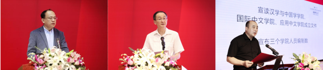 三个新学院的党委书记随后代表学院师生员工进行了表态发言,表示拥护和贯彻学校的战略部署,迎难而上,锐意进取,实现学院良好发展,为国际中文教育事业做出更好更大贡献的决心。