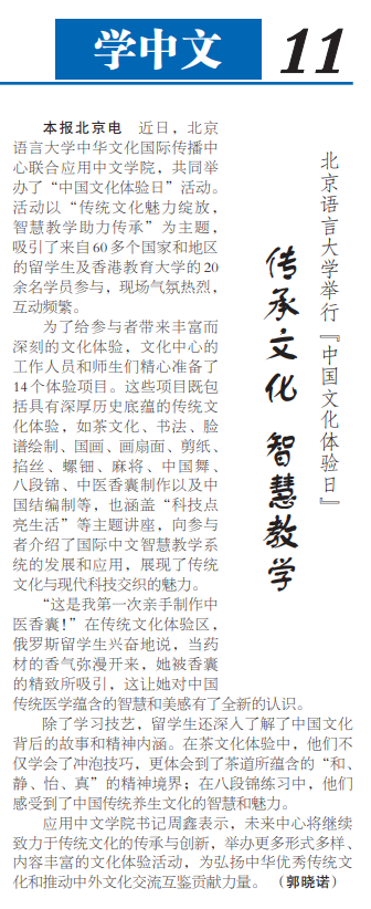 为帮助国际学生在学习中文的同时了解中国国情文化,近距离接触中国社会,学院组织国际学生开展与中国学生交流、参观名胜古迹、走访工厂企业等语言实践活动和丰富多彩的文化体验活动。