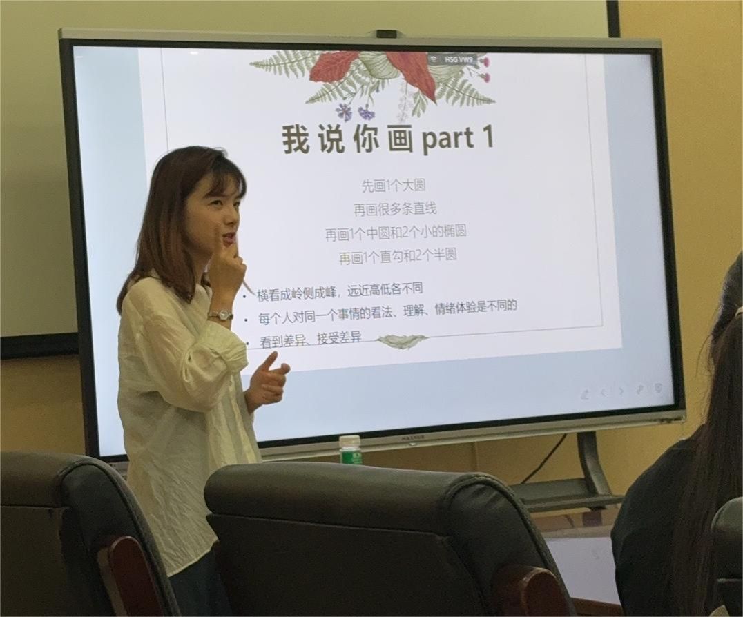 讲座的互动环节将现场气氛推向高潮。朱医生组织大家开展 “我说你画” 游戏,在听到同一位同学的描述下,大家画出的图案却千差万别,以艺术表达形式生动揭示个体认知差异,引导学生们在接纳多元中建立自我认同。